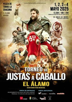 El Gran Torneo de Justas regresa a la Feria Medieval El Álamo, que celebra su XXVIII edición 2025 del jueves 1 al domingo 4 de mayo. La plaza de toros La Chacona se transforma en un engalanado palenque con capacidad para 4.500 personas. Tres pases diarios 13:30, 18:00 y 20:00h ( excepto domingo solamente 13:30h y 18:00h). Entradas desde 6€ Adulto. Desde 4€ los niños hasta 10 años. De acceso gratuito, la feria abre de 11:00 a 24:00.